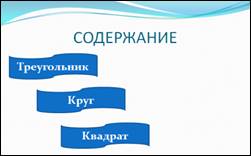 2. На втором слайде поместить содержание презентации из трёх разделов, используя фигуры или объект WordArt. Например,