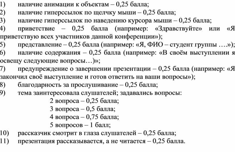 10) приветствие – 0,25 балла (например: «Здравствуйте» или «Я приветствую всех участников данной конференции»);