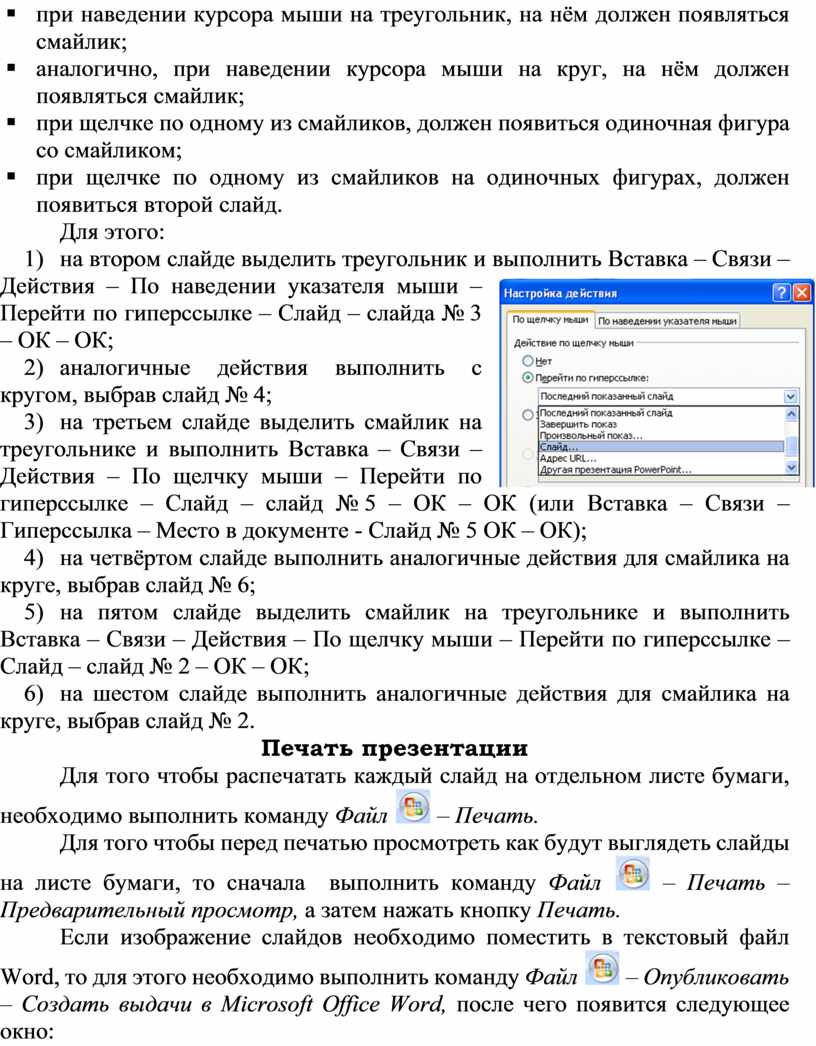 5) на пятом слайде выделить смайлик на треугольнике и выполнить Вставка – Связи – Действия – По щелчку мыши – Перейти по гиперссылке – Слайд – слайд № 2 – ОК – ОК;