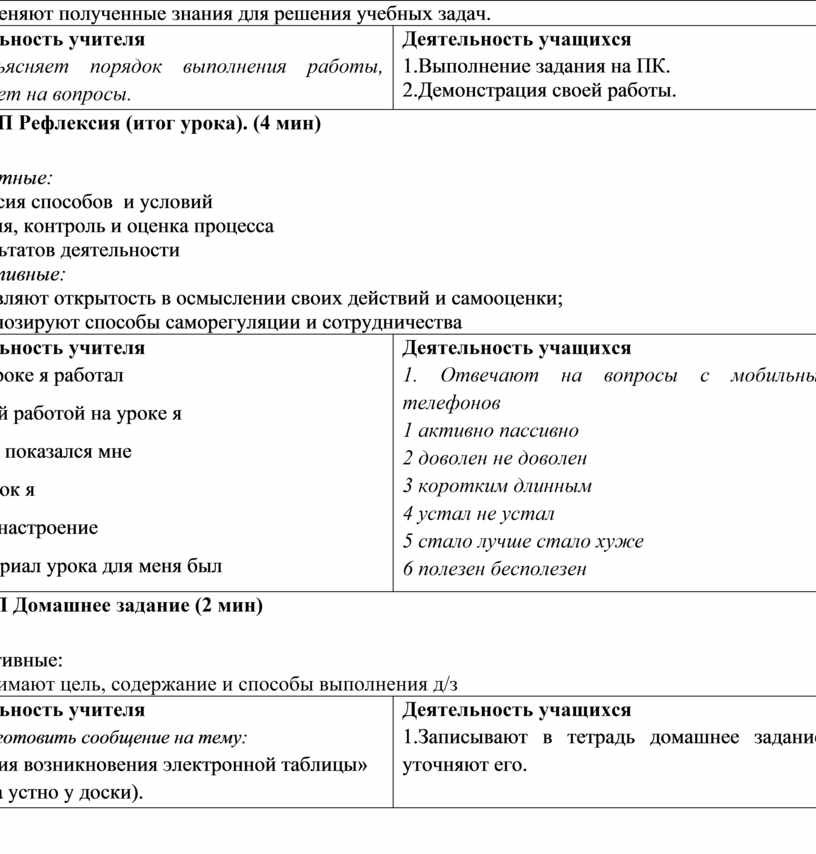 Деятельность учащихся Дети берут в руки мобильные телефоны и выполняют тест по теме «Электронные таблицы», у кого нет подключение к интернету, рассаживаются за ПК. -выполняют тест |