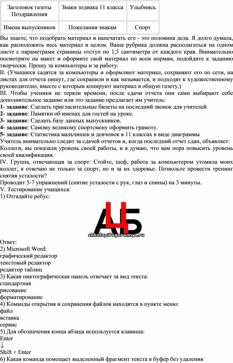 Вы знаете, что подобрать материал и напечатать его - это половина дела. Я долго думала, как расположить весь материал в целом. Ваша рубрика должна располагаться на одном листе с параметрами страницы отступ по 1,5 сантиметра от каждого края. Внимательно посмотрите на макет и оформите свой материал по всем нормам, подойдите к заданию творчески. Прошу за компьютеры и за работу. II. (Учащиеся садятся за компьютеры и оформляют материал, сохраняют его по сети, на листах для отчета пишут, где сохранили и как называется, и подходят к художественному руководителю, вместе с которым копируют материал в общую газету.) III. Чтобы ученики не теряли времени, после сдачи отчета они сами выбирают себе дополнительное задание или это задание предлагает им учитель: 1- задание: Сделать пригласительные билеты на последний звонок для учителей 2- задание: Памятки об именах для гостей на уроке. 3- задание: Сделать базу данных выпускников. 4- задание: Самому великому спортсмену оформить грамоту. 5- задание: Статистика мальчишек и девчонок в 11 классах в виде диаграммы Учитель внимательно следит за сдачей отчетов и, когда последний отчет сдан, объявляет: Коллеги, вы показали уровень своей работы, и я думаю, что вам пора повысить уровень своей квалификации. IV. Группа, отвечающая за спорт: Стойте, шеф, работа за компьютером утомила моих коллег, я отвечаю не только за спорт, но и за их здоровье. Позвольте провести тренинг снятия усталости? Проводит 5-7 упражнений (снятие усталости с рук, глаз и спины) на 3 минуты. V. Тестирование учащихся: 1) Отгадайте ребус: