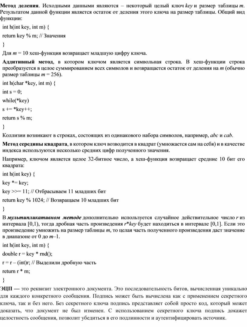 Метод деления. Исходными данными являются – некоторый целый ключ key и размер таблицы m. Результатом данной функции является остаток от деления этого ключа на размер таблицы. Общий вид функции:
