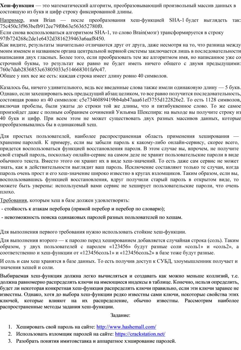 Хеш-функция — это математический алгоритм, преобразовывающий произвольный массив данных в состоящую из букв и цифр строку фиксированной длины.