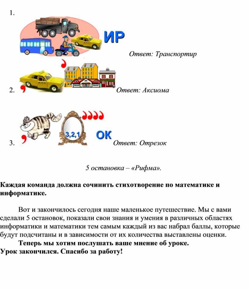 Вот и закончилось сегодня наше маленькое путешествие. Мы с вами сделали 5 остановок, показали свои знания и умения в различных областях информатики и математики тем самым каждый из вас набрал баллы, которые будут подсчитаны и в зависимости от их количества выставлены оценки.