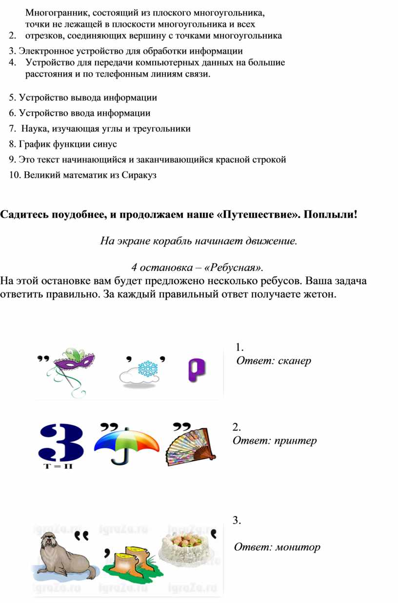 На этой остановке вам будет предложено несколько ребусов. Ваша задача ответить правильно. За каждый правильный ответ получаете жетон.