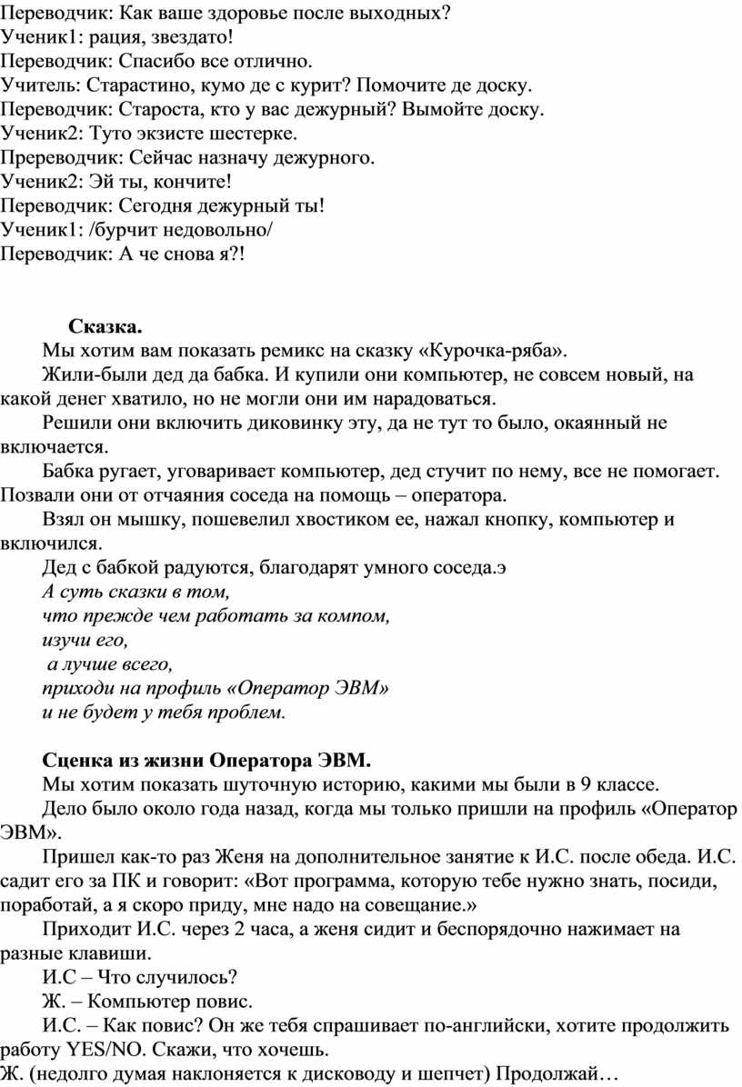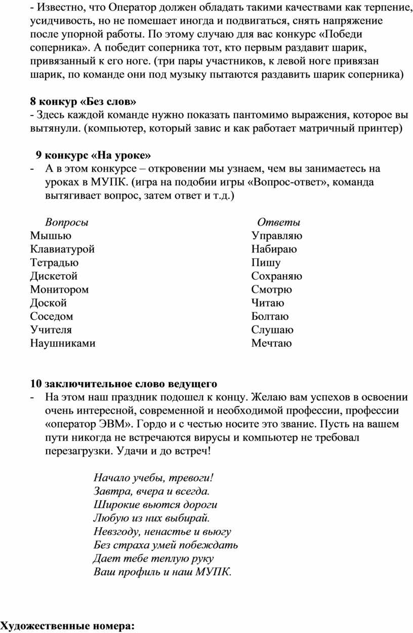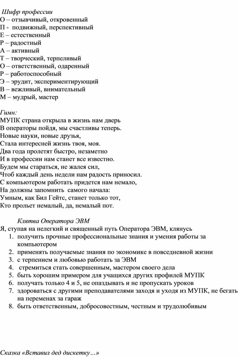 Посвящение в профессию «Оператор ЭВМ» 10класс