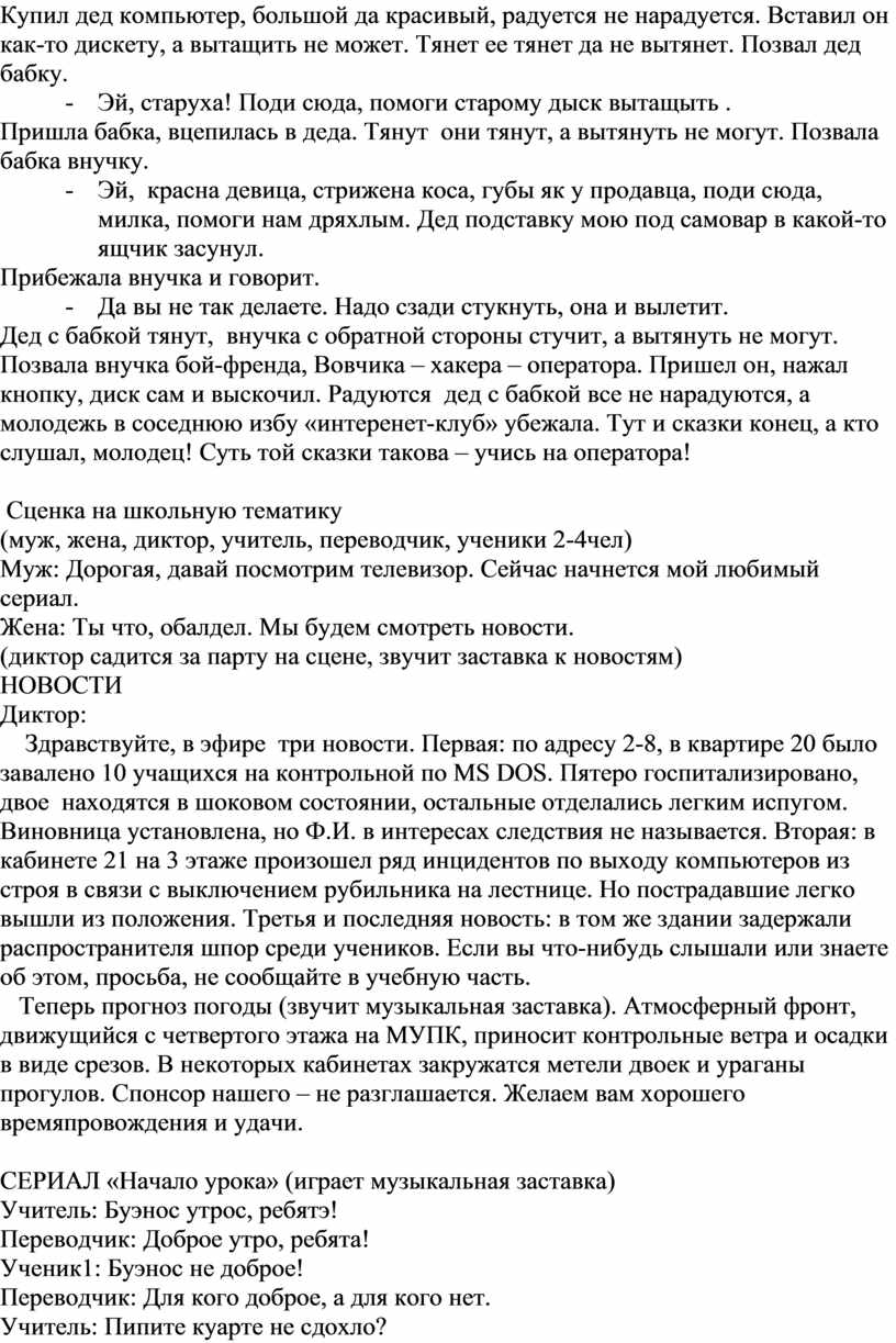 Здравствуйте, в эфире три новости. Первая: по адресу 2-8, в квартире 20 было завалено 10 учащихся на контрольной по MS DOS. Пятеро госпитализировано, двое находятся в шоковом состоянии, остальные отделались легким испугом. Виновница установлена, но Ф.И. в интересах следствия не называется. Вторая: в кабинете 21 на 3 этаже произошел ряд инцидентов по выходу компьютеров из строя в связи с выключением рубильника на лестнице. Но пострадавшие легко вышли из положения. Третья и последняя новость: в том же здании задержали распространителя шпор среди учеников. Если вы что-нибудь слышали или знаете об этом, просьба, не сообщайте в учебную часть.