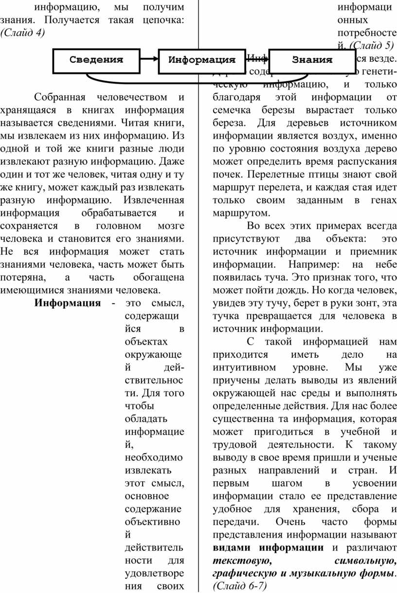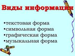С такой информацией нам приходится иметь дело на интуитивном уровне. Мы уже приучены делать выводы из явлений окружающей нас среды и выполнять определенные действия. Для нас более существенна та информация, которая может пригодиться в учебной и трудовой деятельности. К такому выводу в свое время пришли и ученые разных направлений и стран. И первым шагом в усвоении информации стало ее представление удобное для хранения, сбора и передачи. Очень часто формы представления информации называют видами информации и различают текстовую, символьную, графическую и музыкальную формы. (Слайд 6-7)