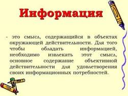 Информация - это смысл, содержащийся в объектах окружающей действительности. Для того чтобы обладать информацией, необходимо извлекать этот смысл, основное содержание объективной действительности для удовлетворения своих информационных потребностей. (Слайд 5)