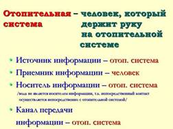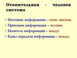 Отопительная система - человек: Отопительная система - источник информации, человек - приемник, канал передачи - воздух, носитель информации - воздух. (Слайд 15)