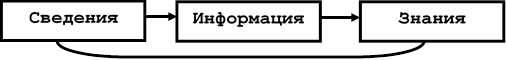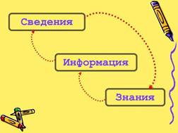 Собранная человечеством и хранящаяся в книгах информация называется сведениями. Читая книги, мы извлекаем из них информацию. Из одной и той же книги разные люди извлекают разную информацию. Даже один и тот же человек, читая одну и ту же книгу, может каждый раз извлекать разную информацию. Извлеченная информация обрабатывается и сохраняется в головном мозге человека и становится его знаниями. Не вся информация может стать знаниями человека, часть может быть потеряна, а часть обогащена имеющимися знаниями человека.