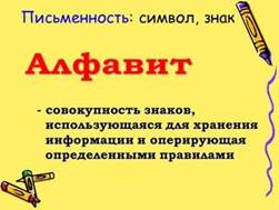 Одним из главных достижений человечества стало создание письменности. Когда окружающий мир стали описывать с помощью символов или знаков. Конечная совокупность знаков, использующаяся для хранения информации и оперирующая определенными правилами, называется алфавитом. (Слайд 8) Примерами алфавитов являются не только набор знаков русского или другого языков, но и язык жестов, математический набор символов. Предметы, использующиеся для хранения и передачи информации, называются носителями. Носителями информации является компьютерный диск, книга, берестяная грамота и т. д. Данные носители позволяют сохранять информацию. (Слайд 9)
