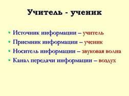 Учитель - ученик: учитель - источник информации, ученик - приемник информации, носитель информации - звуковая волна, воздух - канал передачи информации.(Слайд 12)