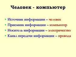 Человек - компьютер: человек - источник информации, компьютер - приемник, электричество - носитель информации, канал передачи - провода. (Слайд 13)