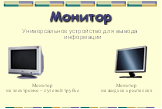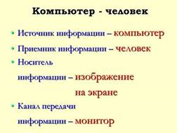 Компьютер - человек: Компьютер - источник, человек - приемник, канал передачи - монитор, носитель информации - изображение на экране. (Слайд 14)