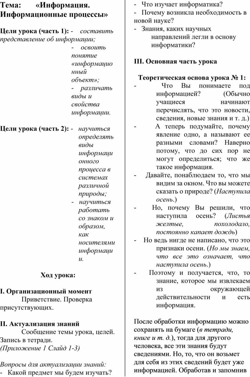 Методическая разработка урока по теме: «Информация. Информационные процессы» предназначена для преподавателей информатики и ИКТ.