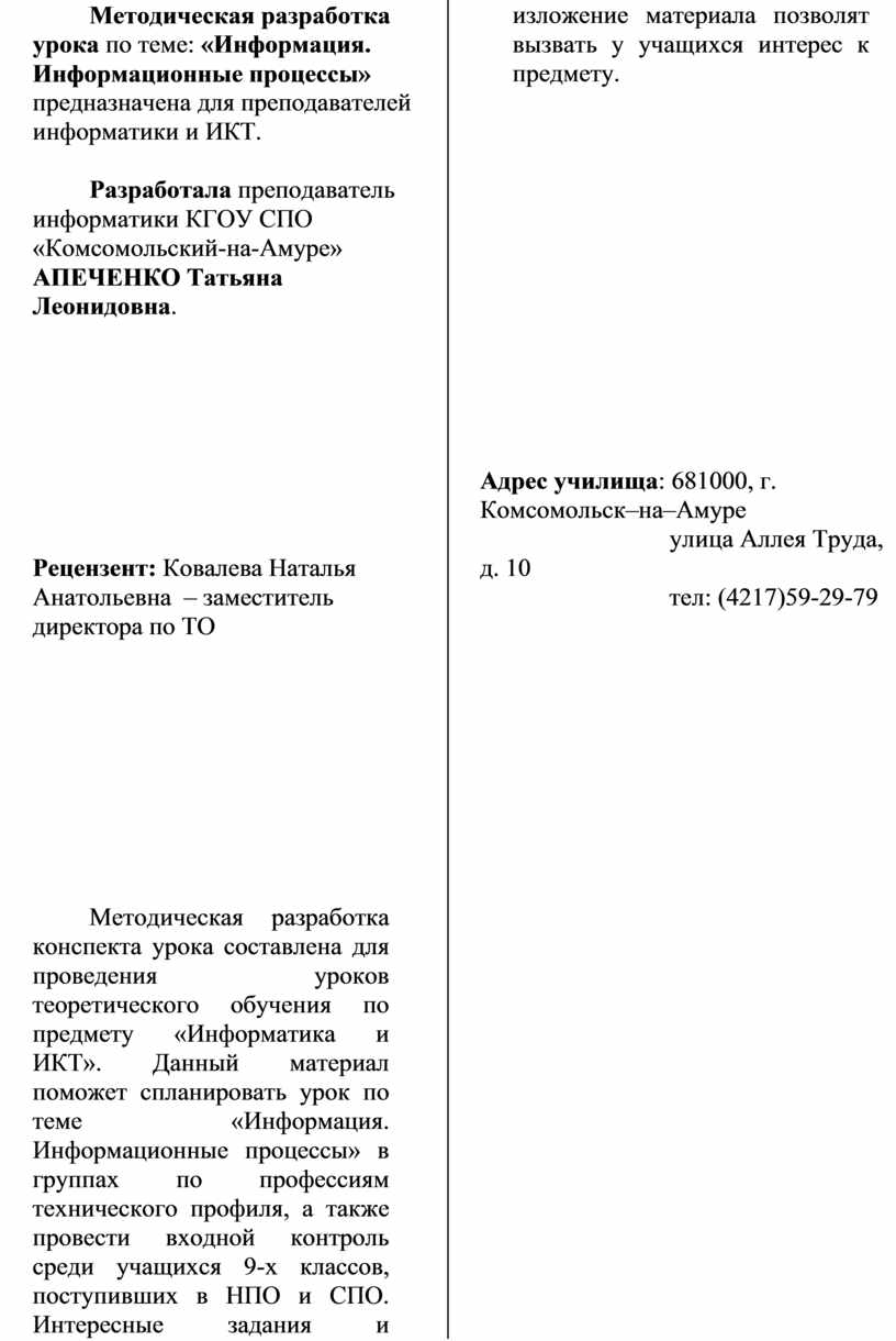 Разработала преподаватель информатики КГОУ СПО «Комсомольский-на-Амуре» АПЕЧЕНКО Татьяна Леонидовна.