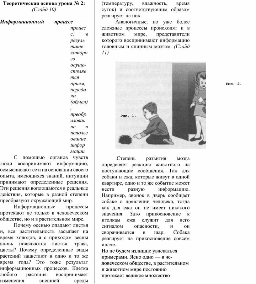 Но не будем излишне увлекаться примерами. Ясно одно — в человеческом обществе, в растительном и животном мире постоянно протекает великое множество информационных процессов, в которых люди, животные и растения участвуют в соответствии со своими возможностями. Это то, что отличает живую природу от неживой, у которой отсутствуют органы восприятия и обработки сигналов внешней и внутренней среды. Здесь изменения могут происходить только в результате физического или химического воздействия, а не информационного процесса.