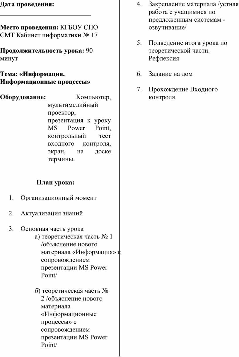 Методическая разработка конспекта урока составлена для проведения уроков теоретического обучения по предмету «Информатика и ИКТ». Данный материал поможет спланировать урок по теме «Информация. Информационные процессы» в группах по профессиям технического профиля, а также провести входной контроль среди учащихся 9-х классов, поступивших в НПО и СПО. Интересные задания и изложение материала позволят вызвать у учащихся интерес к предмету.