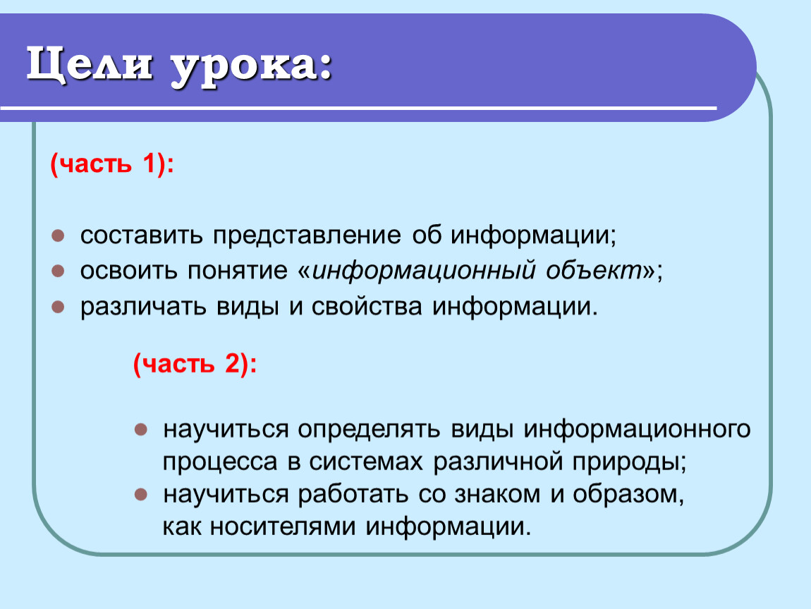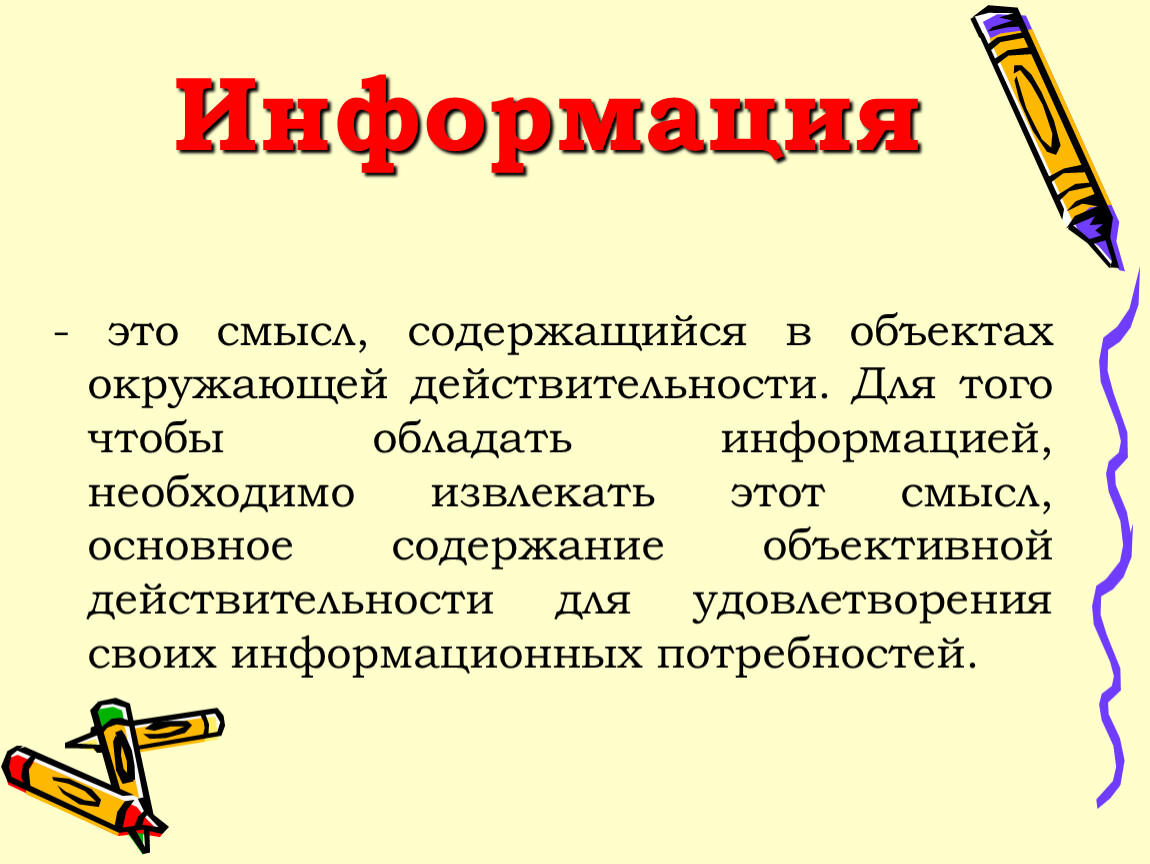 - это смысл, содержащийся в объектах окружающей действительности. Для того чтобы обладать информацией, необходимо извлекать этот смысл, основное содержание объективной действительности для удовлетворения своих информационных потребностей.