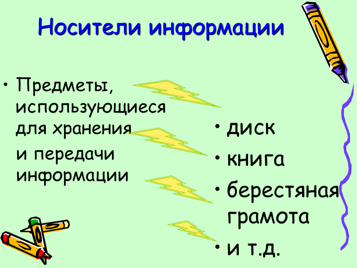 Носителями информации называют объекты, использующиеся как для хранения информации, так и для передачи информации.