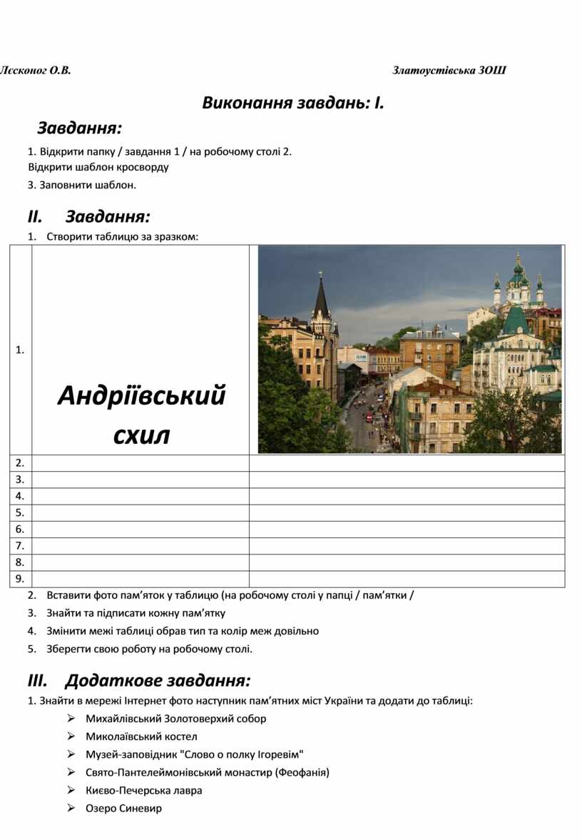 1. Знайти в мережі Інтернет фото наступник пам’ятних міст України та додати до таблиці: