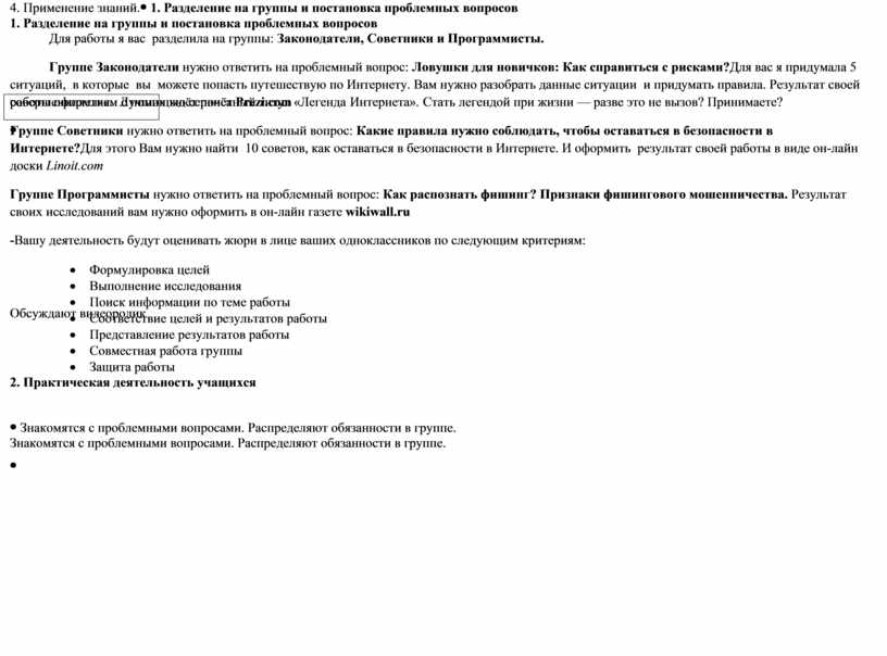 1. Разделение на группы и постановка проблемных вопросов Для работы я вас разделила на группы: Законодатели, Советники и Программисты. Группе Законодатели нужно ответить на проблемный вопрос: Ловушки для новичков: Как справиться с рисками?Для вас я придумала 5 ситуаций, в которые вы можете попасть путешествую по Интернету. Вам нужно разобрать данные ситуации и придумать правила. Результат своей работы оформляем с помощью сервиса Prezi.com Группе Советники нужно ответить на проблемный вопрос: Какие правила нужно соблюдать, чтобы оставаться в безопасности в Интернете?Для этого Вам нужно найти 10 советов, как оставаться в безопасности в Интернете. И оформить результат своей работы в виде он-лайн доски Linoit.com Группе Программисты нужно ответить на проблемный вопрос: Как распознать фишинг? Признаки фишингового мошенничества. Результат своих исследований вам нужно оформить в он-лайн газете wikiwall.ru -Вашу деятельность будут оценивать жюри в лице ваших одноклассников по следующим критериям: · Формулировка целей · Выполнение исследования · Поиск информации по теме работы · Соответствие целей и результатов работы · Представление результатов работы · Совместная работа группы · Защита работы 2. Практическая деятельность учащихся