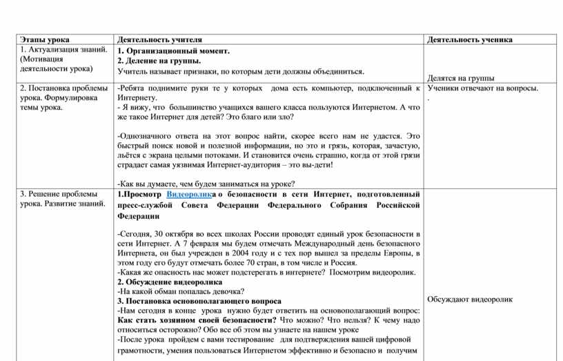 1.Просмотр Видеоролика о безопасности в сети Интернет, подготовленный пресс-службой Совета Федерации Федерального Собрания Российской Федерации -Сегодня, 30 октября во всех школах России проводят единый урок безопасности в сети Интернет. А 7 февраля мы будем отмечать Международный день безопасного Интернета, он был учрежден в 2004 году и с тех пор вышел за пределы Европы, в этом году его будут отмечать более 70 стран, в том числе и Россия. -Какая же опасность нас может подстерегать в интернете? Посмотрим видеоролик. 2. Обсуждение видеоролика -На какой обман попалась девочка? 3. Постановка основополагающего вопроса -Нам сегодня в конце урока нужно будет ответить на основополагающий вопрос: Как стать хозяином своей безопасности? Что можно? Что нельзя? К чему надо относиться осторожно? Обо все об этом вы узнаете на нашем уроке -После урока пройдем с вами тестирование для подтверждения вашей цифровой грамотности, умения пользоваться Интернетом эффективно и безопасно и получим сертификат от гугла .Сертификат Google — весомый аргумент интернет совершеннолетия. Лучших ждёт почётный титул «Легенда Интернета». Стать легендой при жизни — разве это не вызов? Принимаете?