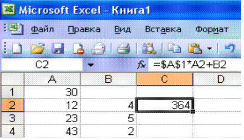 1) =A1*A2+B2; 2)=$A$1*$A$2+$B$2; 3)=$A$1*A3+B3;