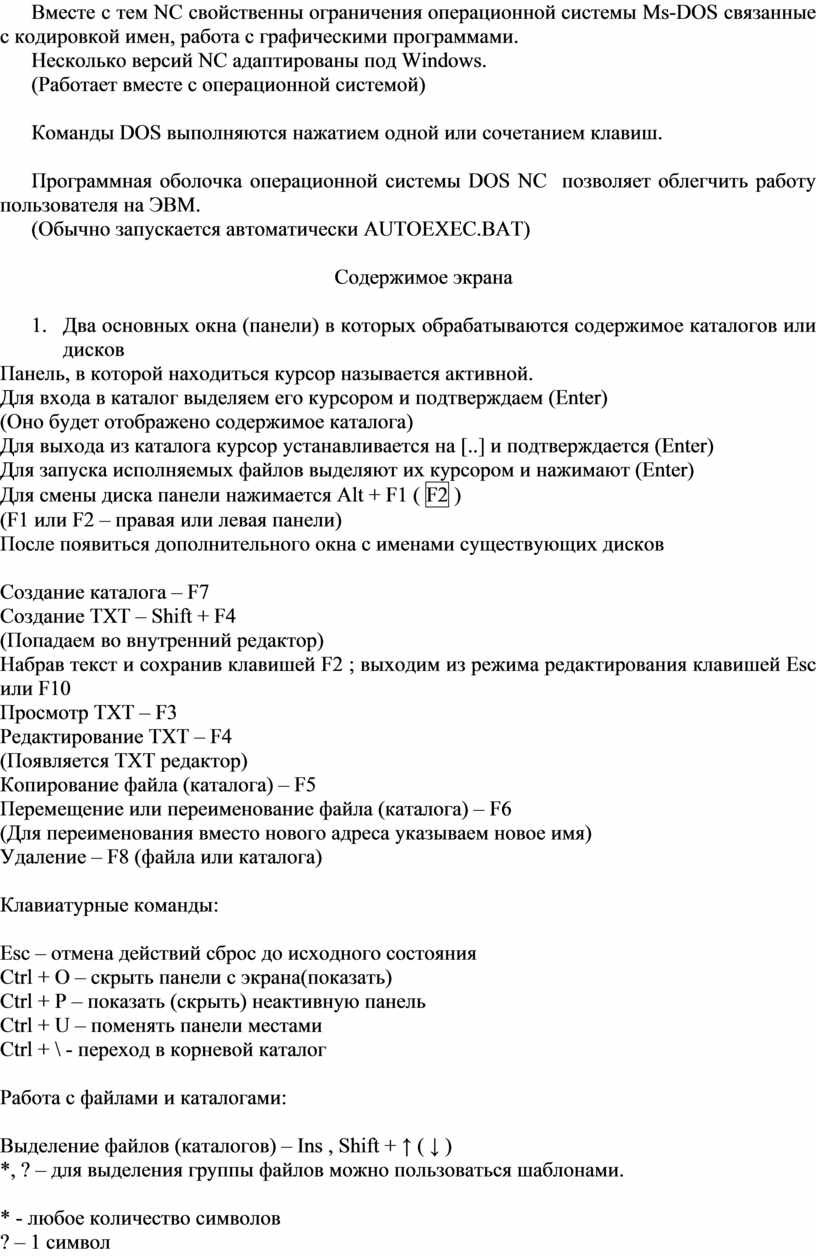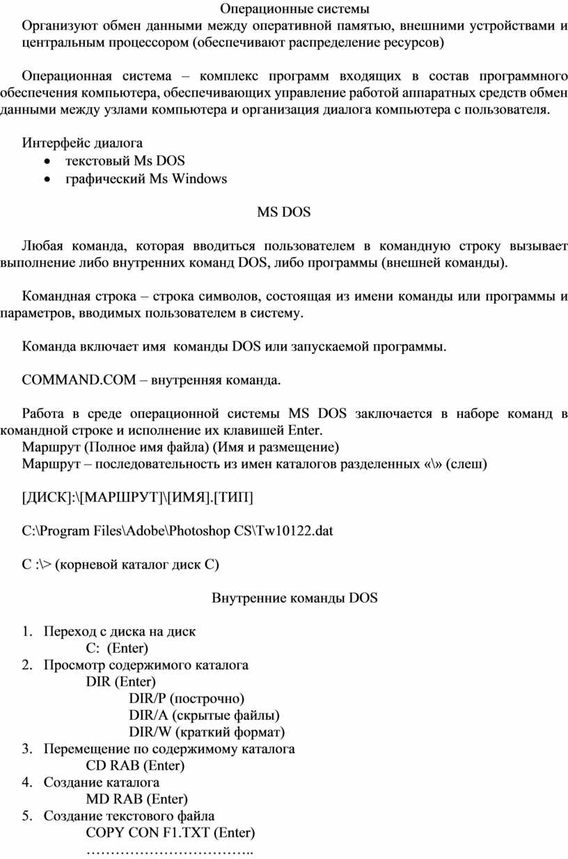 Работа в среде операционной системы MS DOS заключается в наборе команд в командной строке и исполнение их клавишей Enter.