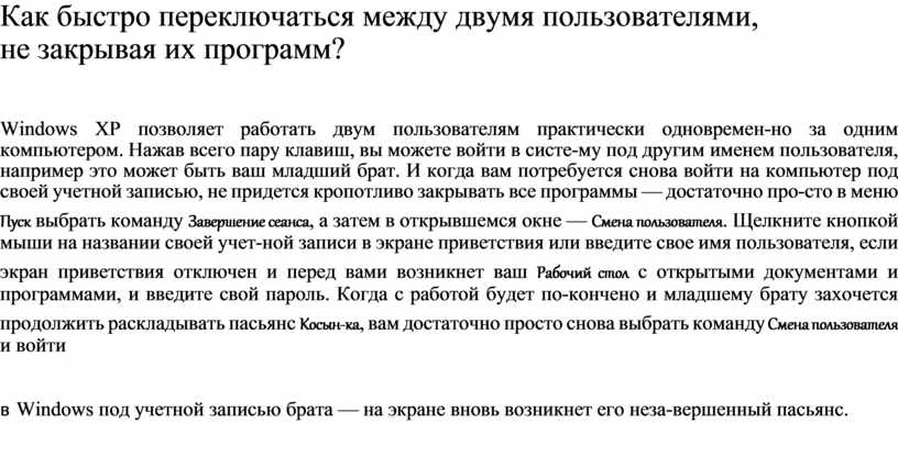 Windows XP позволяет работать двум пользователям практически одновремен-но за одним компьютером. Нажав всего пару клавиш, вы можете войти в систе-му под другим именем пользователя, например это может быть ваш младший брат. И когда вам потребуется снова войти на компьютер под своей учетной записью, не придется кропотливо закрывать все программы — достаточно про-сто в меню Пуск выбрать команду Завершение сеанса, а затем в открывшемся окне — Смена пользователя. Щелкните кнопкой мыши на названии своей учет-ной записи в экране приветствия или введите свое имя пользователя, если экран приветствия отключен и перед вами возникнет ваш Рабочий стол с открытыми документами и программами, и введите свой пароль. Когда с работой будет по-кончено и младшему брату захочется продолжить раскладывать пасьянс Косын-ка, вам достаточно просто снова выбрать команду Смена пользователя и войти
