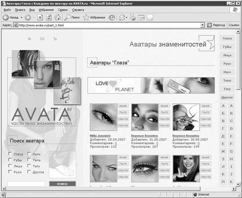 Существуют сотни сайтов, содержащих тысячи различных аватаров (рис. 6.15) — рисованных и фотографических, анимированных и в виде надписей, частей тела или абстракций. Вот адреса наиболее заметных сайтов подобного рода: www. avata.ru, www.moreavatar.ru, www.allavatars.ru, www.avatarka.ru, www.moreavatar. info, www.stavatar.net, www.avatarku.ru.
