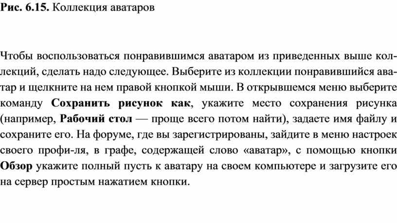 Чтобы воспользоваться понравившимся аватаром из приведенных выше кол-лекций, сделать надо следующее. Выберите из коллекции понравившийся ава-тар и щелкните на нем правой кнопкой мыши. В открывшемся меню выберите команду Сохранить рисунок как, укажите место сохранения рисунка (например, Рабочий стол — проще всего потом найти), задаете имя файлу и сохраните его. На форуме, где вы зарегистрированы, зайдите в меню настроек своего профи-ля, в графе, содержащей слово «аватар», с помощью кнопки Обзор укажите полный пусть к аватару на своем компьютере и загрузите его на сервер простым нажатием кнопки.