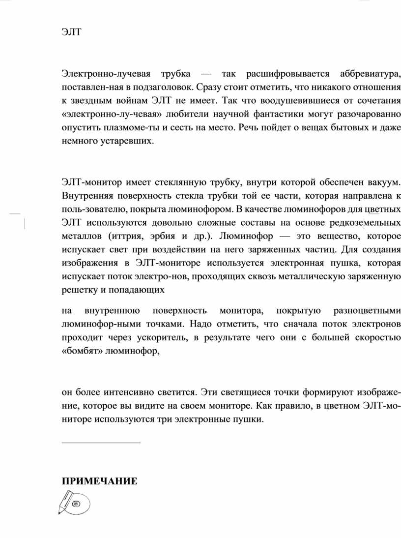 Электронно-лучевая трубка — так расшифровывается аббревиатура, поставлен-ная в подзаголовок. Сразу стоит отметить, что никакого отношения к звездным войнам ЭЛТ не имеет. Так что воодушевившиеся от сочетания «электронно-лу-чевая» любители научной фантастики могут разочарованно опустить плазмоме-ты и сесть на место. Речь пойдет о вещах бытовых и даже немного устаревших.