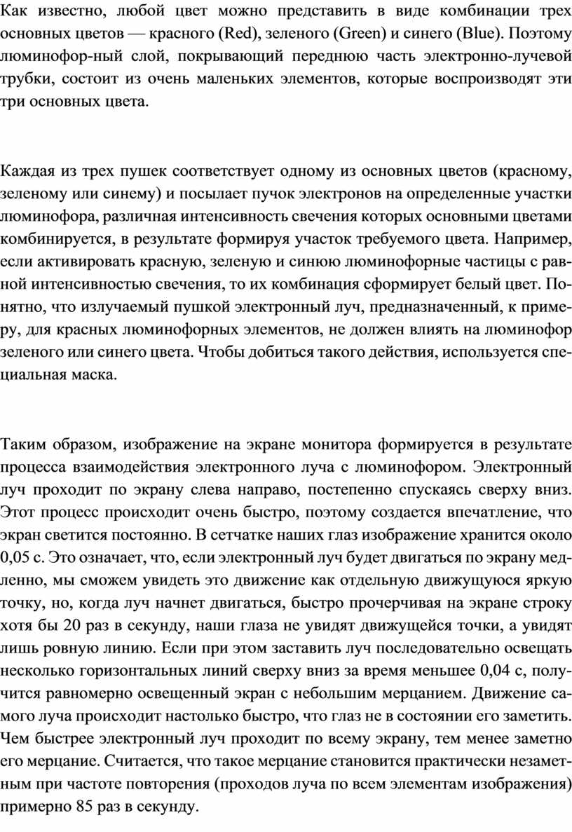 он более интенсивно светится. Эти светящиеся точки формируют изображе-ние, которое вы видите на своем мониторе. Как правило, в цветном ЭЛТ-мо-ниторе используются три электронные пушки.