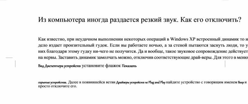 скрытые устройства. Далее в появившейся ветви Драйверы устройств не Plug and Play найдите устройство с говорящим именем Beep и просто отключите его.