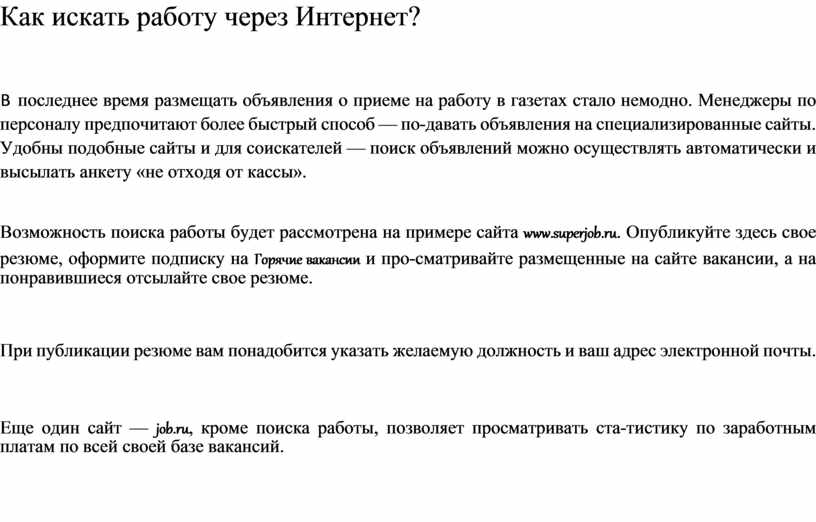 Возможность поиска работы будет рассмотрена на примере сайта www.superjob.ru. Опубликуйте здесь свое резюме, оформите подписку на Горячие вакансии и про-сматривайте размещенные на сайте вакансии, а на понравившиеся отсылайте свое резюме.