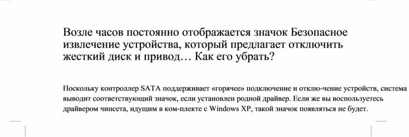 Возле часов постоянно отображается значок Безопасное извлечение устройства, который предлагает отключить жесткий диск и привод… Как его убрать?