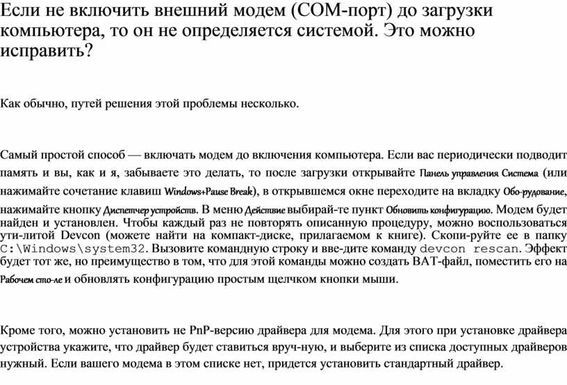 Если не включить внешний модем (COM-порт) до загрузки компьютера, то он не определяется системой. Это можно исправить?
