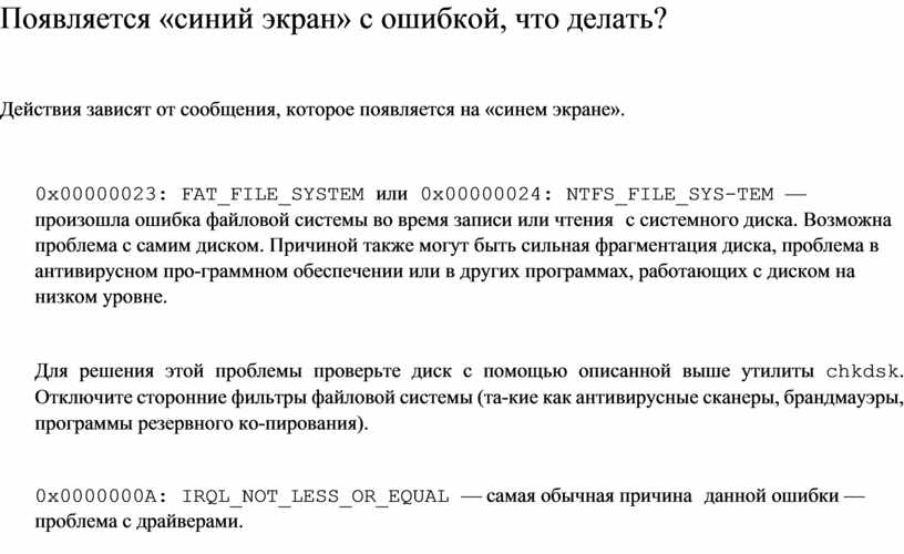 0x00000023: FAT_FILE_SYSTEM или 0x00000024: NTFS_FILE_SYS-TEM — произошла ошибка файловой системы во время записи или чтения с системного диска. Возможна проблема с самим диском. Причиной также могут быть сильная фрагментация диска, проблема в антивирусном про-граммном обеспечении или в других программах, работающих с диском на низком уровне.