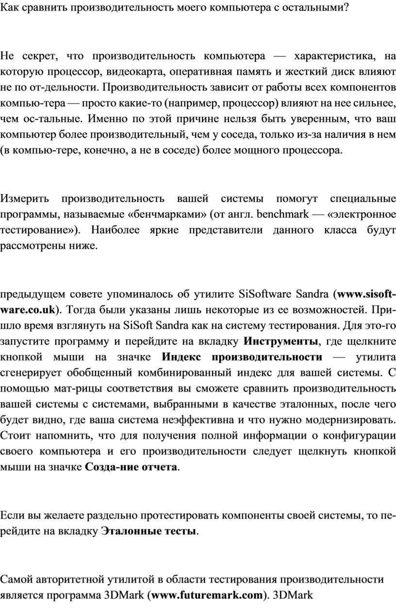 Не секрет, что производительность компьютера — характеристика, на которую процессор, видеокарта, оперативная память и жесткий диск влияют не по от-дельности. Производительность зависит от работы всех компонентов компью-тера — просто какие-то (например, процессор) влияют на нее сильнее, чем ос-тальные. Именно по этой причине нельзя быть уверенным, что ваш компьютер более производительный, чем у соседа, только из-за наличия в нем (в компью-тере, конечно, а не в соседе) более мощного процессора.