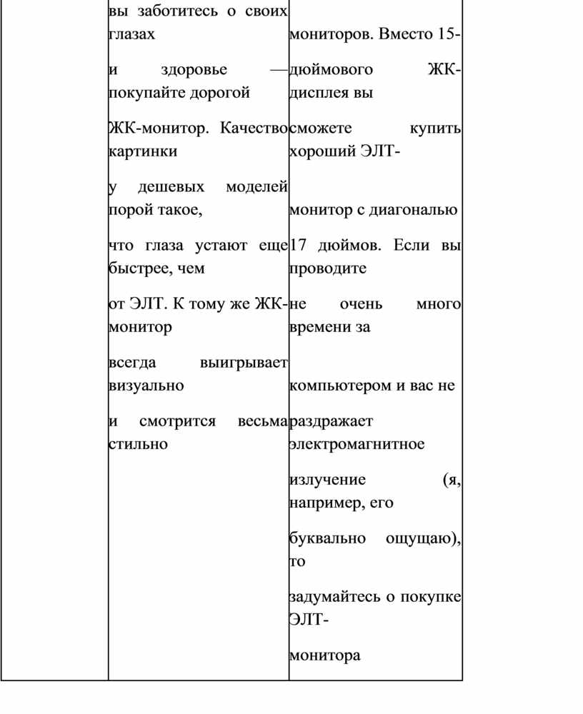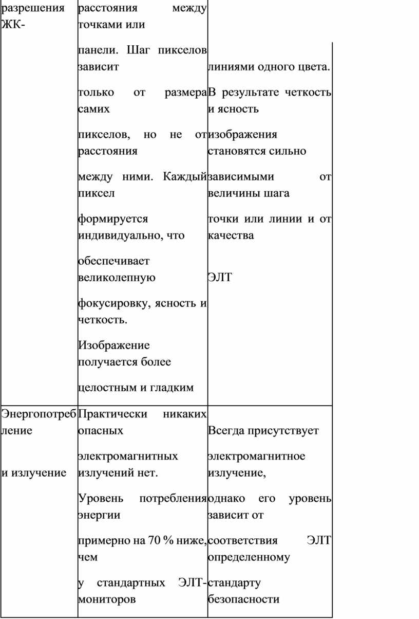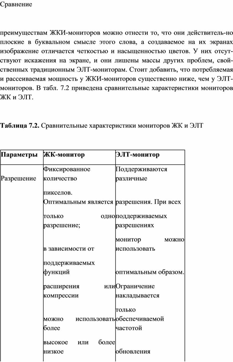 Таблица 7.2. Сравнительные характеристики мониторов ЖК и ЭЛТ