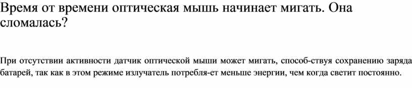 При отсутствии активности датчик оптической мыши может мигать, способ-ствуя сохранению заряда батарей, так как в этом режиме излучатель потребля-ет меньше энергии, чем когда светит постоянно.