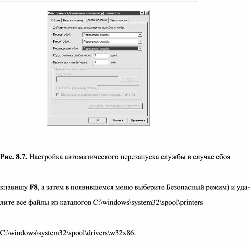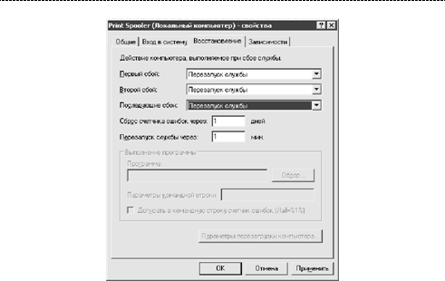Вместе с тем можно заставить Windows XP автоматически выполнять переза-пуск данной службы в случае ошибки. Для этого щелкните на значке искомой службы правой кнопкой мыши и в открывшемся меню выберите команду Свой-ства (либо просто нажмите Alt+Enter). В открывшемся окне перейдите на вклад-ку Восстановление и в качестве действия, выполняемого после сбоя, выберите Перезапуск службы (рис. 8.7).