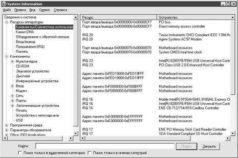 Узнать о конфликтах в вашей системе можно не только с помощью Диспетчера устройств, но и с помощью утилиты Информация о системе (выполните команду меню Пуск Выполнить и в открывшемся окне наберите команду msinfo32). В ней есть даже соответствующий пункт в древовидном меню: Ресурсы аппара-туры Конфликты/Совместное использование (рис. 8.9). Надо отметить, что с помощью данной утилиты можно также получать информацию об удаленном компьютере (меню Вид Удаленный компьютер). Естественно, для всего этого вам необходимо обладать правами администратора на удаленной системе.