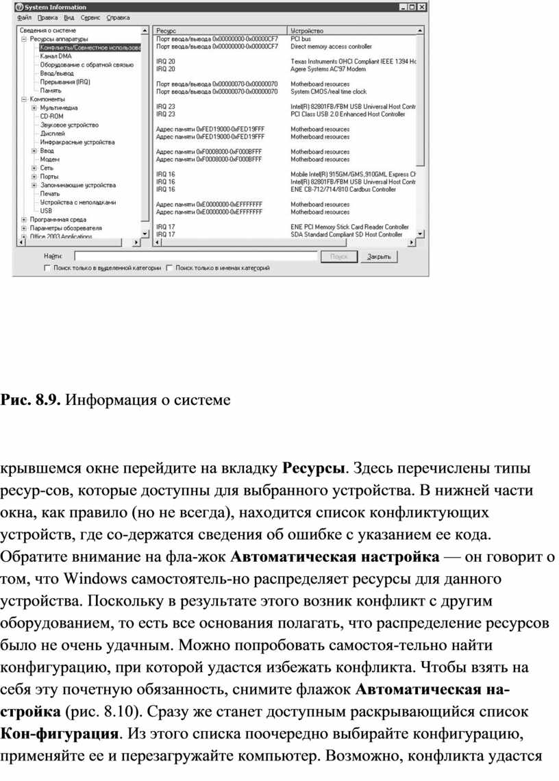 крывшемся окне перейдите на вкладку Ресурсы. Здесь перечислены типы ресур-сов, которые доступны для выбранного устройства. В нижней части окна, как правило (но не всегда), находится список конфликтующих устройств, где со-держатся сведения об ошибке с указанием ее кода. Обратите внимание на фла-жок Автоматическая настройка — он говорит о том, что Windows самостоятель-но распределяет ресурсы для данного устройства. Поскольку в результате этого возник конфликт с другим оборудованием, то есть все основания полагать, что распределение ресурсов было не очень удачным. Можно попробовать самостоя-тельно найти конфигурацию, при которой удастся избежать конфликта. Чтобы взять на себя эту почетную обязанность, снимите флажок Автоматическая на-стройка (рис. 8.10). Сразу же станет доступным раскрывающийся список Кон-фигурация. Из этого списка поочередно выбирайте конфигурацию, применяйте ее и перезагружайте компьютер. Возможно, конфликта удастся