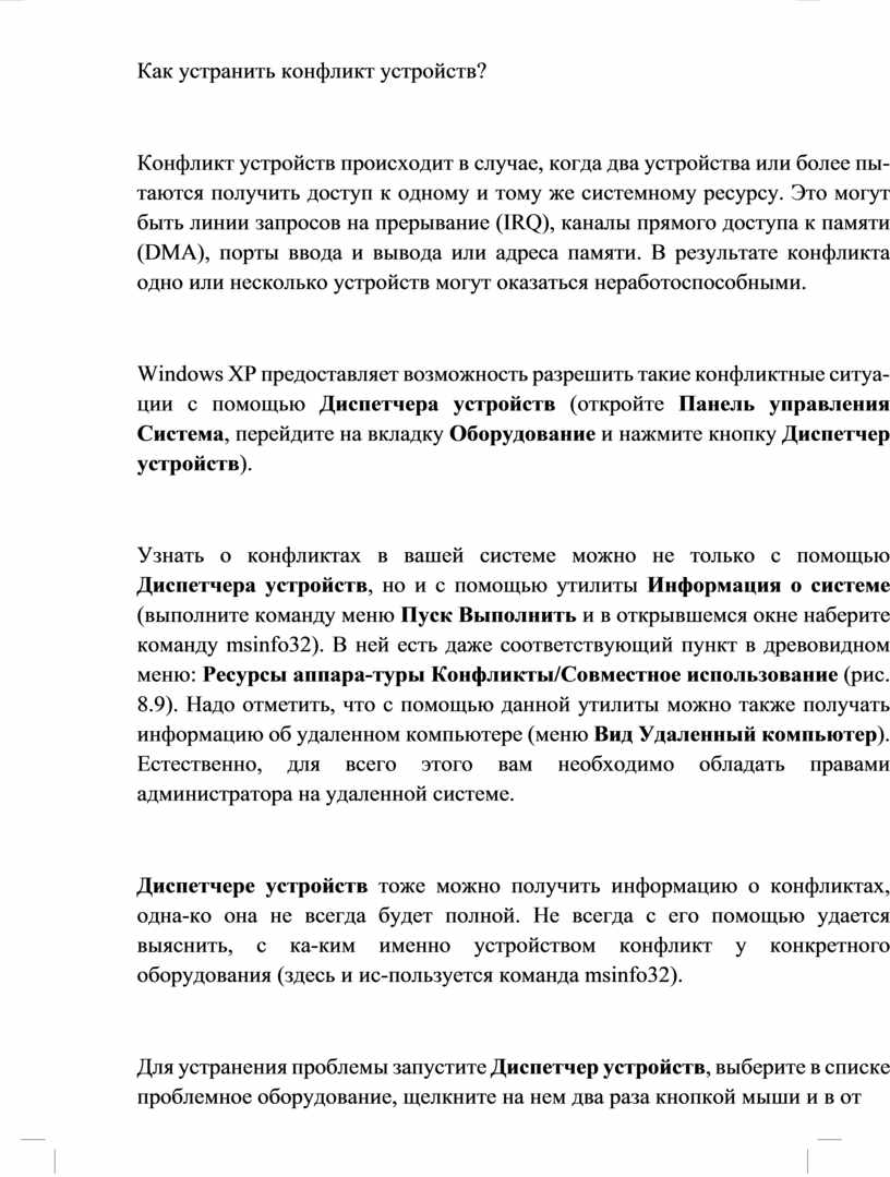 Конфликт устройств происходит в случае, когда два устройства или более пы-таются получить доступ к одному и тому же системному ресурсу. Это могут быть линии запросов на прерывание (IRQ), каналы прямого доступа к памяти (DMA), порты ввода и вывода или адреса памяти. В результате конфликта одно или несколько устройств могут оказаться неработоспособными.