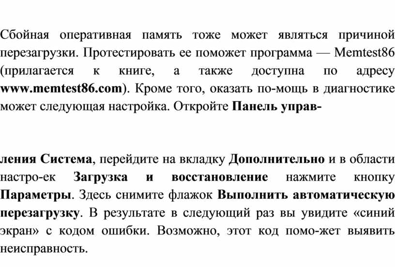ления Система, перейдите на вкладку Дополнительно и в области настро-ек Загрузка и восстановление нажмите кнопку Параметры. Здесь снимите флажок Выполнить автоматическую перезагрузку. В результате в следующий раз вы увидите «синий экран» с кодом ошибки. Возможно, этот код помо-жет выявить неисправность.
