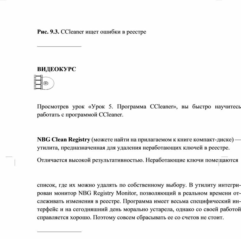 Чтобы исправить ошибки в реестре и провести его «зачистку», перейдите в раз-дел Неполадки и нажмите кнопку Поиск проблем (рис. 9.3). Когда процесс по-дойдет к концу, нажмите кнопку Исправить отмеченные. Утилита предложит сделать резервную копию изменений. Затем еще раз нажмите кнопку Испра-вить отмеченные — ошибочные данные будут удалены.