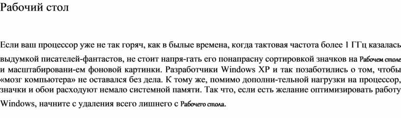 Если ваш процессор уже не так горяч, как в былые времена, когда тактовая частота более 1 ГГц казалась выдумкой писателей-фантастов, не стоит напря-гать его понапрасну сортировкой значков на Рабочем столе и масштабировани-ем фоновой картинки. Разработчики Windows XP и так позаботились о том, чтобы «мозг компьютера» не оставался без дела. К тому же, помимо дополни-тельной нагрузки на процессор, значки и обои расходуют немало системной памяти. Так что, если есть желание оптимизировать работу Windows, начните с удаления всего лишнего с Рабочего стола.